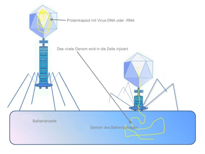 Bakteriophagen (kurz: Phagen) sind Viren, die Bakterien befallen und infizieren können. Das Wort “Bakteriophage” lässt sich aus dem altgriechischen folgendermaßen übersetzen: βακτήριον/baktérion (Bakterien) + φαγεῖν/phageín (fressen). Ich weiß, der Name ist verwirrend, also nochmal: Bakteriophagen sind KEINE Bakterien, sondern hochspezialisierte Viren, die an einen spezifischen Wirt gebunden sind. Es gibt etliche verschiedene Phagentypen, die überall dort vorkommen, wo es auch Bakterien gibt. Nachfolgend ein Bild mit grobem Aufbau: