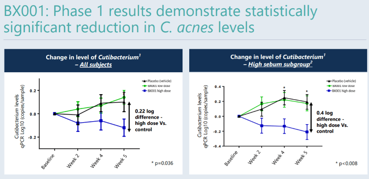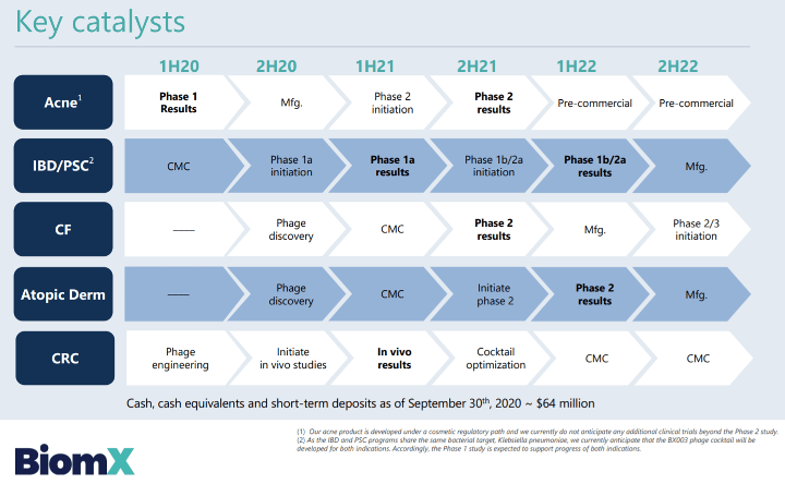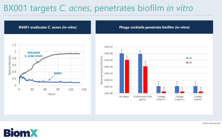 Im März 2020 veröffentlichte BiomX positive Ergebnisse einer kosmetischen und placebokontrollierten Phase-1-Studie. Die primären Endpunkte zu Sicherheit und Verträglichkeit sowie weitere Endpunkte zur signifikanten Reduktion von C.-acnes-Stämmen wurden erreicht. Laut BiomX konnte dieser Phagencocktail bei 96% aller C.-acnes-Stämme eine positive Wirkung hervorrufen (in vitro).