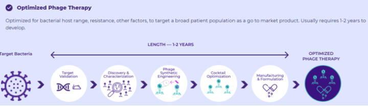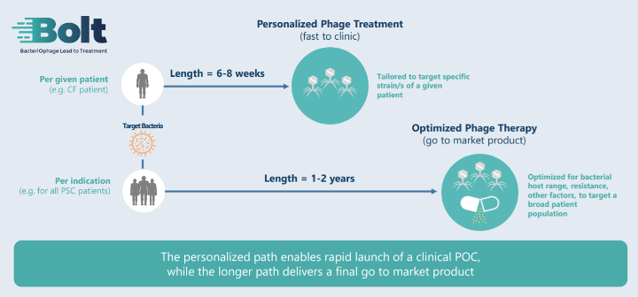 Man unterscheidet einen schnelleren + personalisierten Weg, der auf einen bestimmten Bakterienstamm abzielt, den man bei einem Patienten als Pathogen identifizieren konnte, sowie einen langsameren + generalisierten Weg, der auf eine breitere Patientengruppe abzielt. Ersterer Weg ermöglicht es, innerhalb von 6-8 Wochen einen geeigneten Phagencocktail ausfindig zu machen und ausreichend zu validieren. Letzterer Weg dauert zwar deutlich länger, jedoch kann man hier über synthetische Engineering-Tools (z.B. Genome-Editing) Phagen derartig modifizieren und optimieren, dass sie auch für sehr große Patientengruppen und -populationen markttauglich sind: