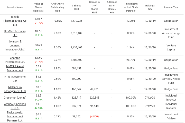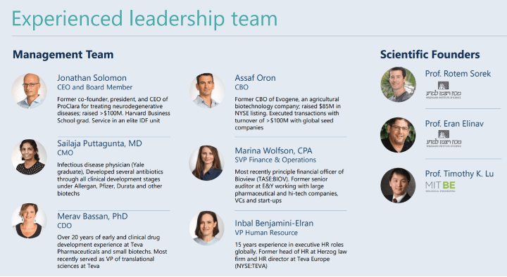 Unter den größten Einzelaktionären findet man viele bekannte Namen, z.B. Big Pharma (Takeda, Johnson&Johnson) und auch angesehene Healthcare-Investoren (OrbiMed, Chardan,..). Die weiter oben genannte Chardan Healthcare Acquisition Corp., das Vehikel, über das BiomX an die Börse ging, ist eine SPAC (Special Purpose Acquisition Corp.) von Chardan. Auch Board-Mitglieder wie Jonas Grossman oder Gbolahan Amusa sind am Unternehmen beteiligt. Laut IPO-Prospekt hält auch CEO Jonathan Solomon ein größeres Optionspaket. Insgesamt finde ich die institutionelle Besetzung sehr gut und spricht für die Qualität von BiomX.