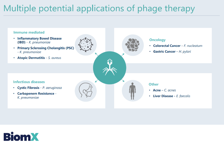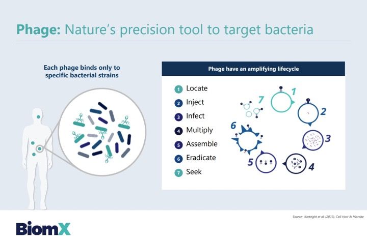 BiomX wurde 2015 gegründet und hat seinen Sitz in Ness Ziona, Israel. Wie oben erwähnt nutzt das Unternehmen sowohl natürlich vorkommende als auch genetisch modifizierte Phagen (nachfolgend auch Phagencocktail genannt) als personalisierten Therapieansatz, die auf Bakterien und die daraus hervorgehenden infektiösen Erkrankungen abzielen.
