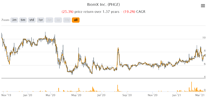 Am 17. Juli 2019 wurde verkündet, dass man per Reverse-Merger mit der SPAC Chardan Healthcare Acquisition Corp. mit einer Marktkapitalisierung von 250 Mio USD an die Börse geht (NYSE). Der erste Handelstag (als Ticker $PHGE) war nach Abschluss des Mergers der 29.10.2019. Zudem erfolgte am 03. Februar 2020 ein Dual-Listing an der israelischen Börse (TASE). Seit BiomX’ initialem Börsengang hat der Aktienkurs nicht viel getan und notiert aktuell sogar deutlich unter dem Ausgabepreis.