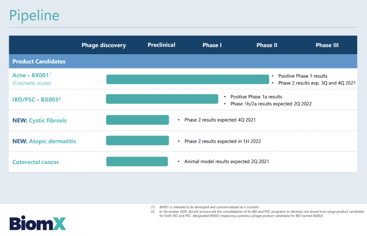 BX003 hat bereits positive Ergebnisse einer Phase-1a-Studie gemeldet, im zweiten Quartal 2022 werden Ergebnisse der Phase-1b/2a erwartet. Das Besondere an BX003 ist meiner Meinung nach, dass es sich um eine orale Phagentherapie handelt, und BiomX hier laut eigenen Angaben den ersten wirklichen - durch klinische Studien belegten - Erfolg vorweisen kann. Die Möglichkeit zur oralen Gabe von Medikamenten ist ein großer Vorteil bei der Behandlung und Compliance des Patienten.