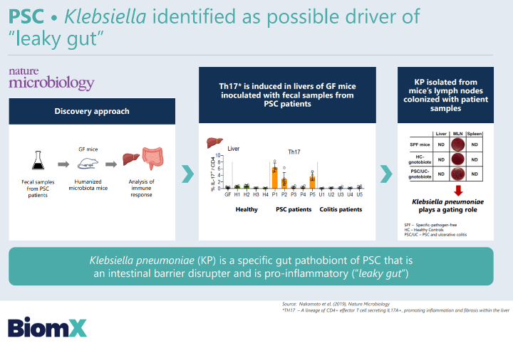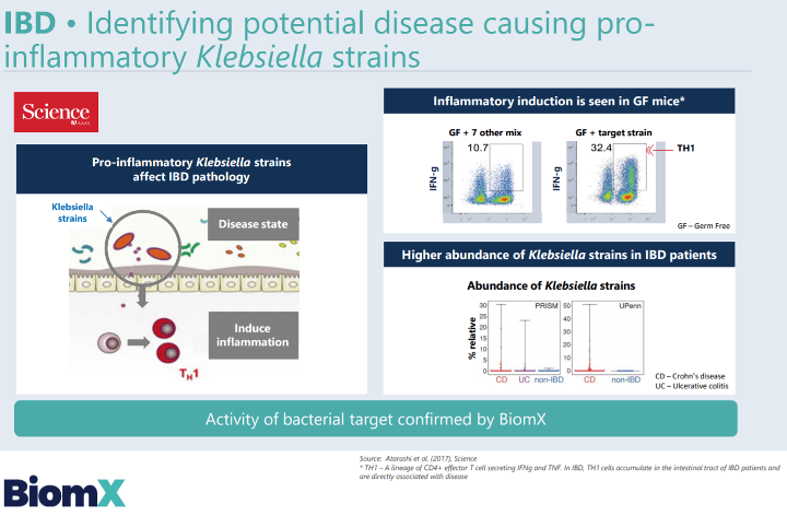Neben dem Akne-Kosmetikum hat BiomX weitere Phagentherapien aus verschiedensten Bereichen in der Pipeline, die auf diverse Bakterienstämme und hervorgehende Krankheiten abzielen. Nach BX001 am weitesten fortgeschritten ist BX003, ein Phagencocktail, der auf das Stäbchenbakterium Klebsiella pneumoniae (K. pneumoniae) abzielt. Hier läuft eine klinische Phase-1-Studie für die Indikationen IBD (chronisch-entzündliche Darmerkrankungen, z.B. Colitis ulcerosa oder Morbus Crohn) sowie PSC (primär sklerosierende Cholangitis, eine chronische Entzündung der Gallenwege). Ursprünglich gab es hier zwei verschiedene Phagencocktails (BX002 + BX003), diese wurden aber in eine einzelne Studie (BX003) zusammengelagert. Der Nachweis, dass sowohl IBD als auch PSC durch das Vorhandensein gewisser pro-inflammatorischer K.-pneumoniae-Stämme auftreten oder verschlimmert werden kann, wurde bereits belegt: